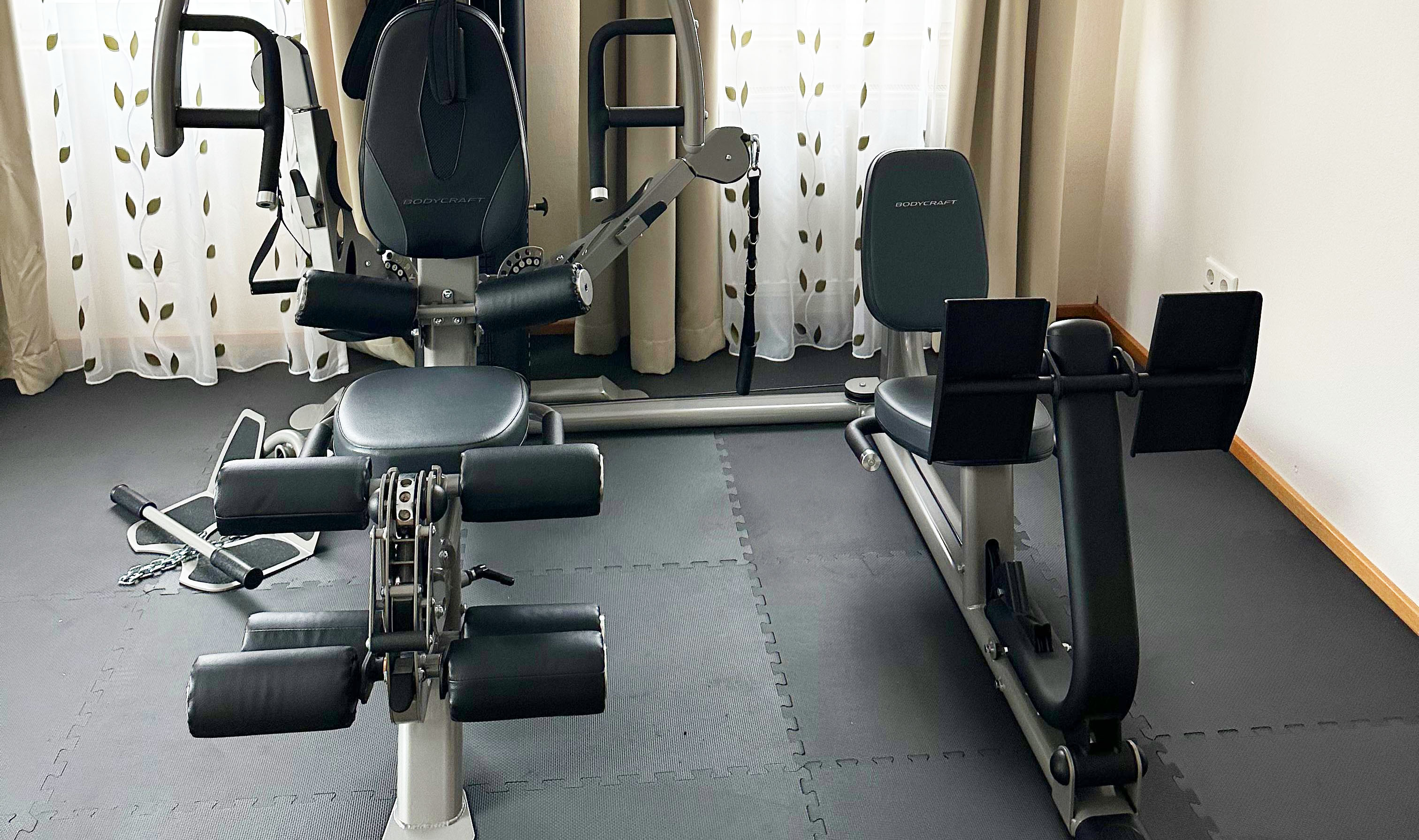 Unser neuer Fitnessraum im Hotel am Herkules bietet alles, was Sie für ein effektives Ganzkörpertraining benötigen. Im Mittelpunkt steht eine hochwertige BodyCraft-Multistation mit zahlreichen Übungsmöglichkeiten für Rücken, Brust, Schultern, Arme und Beine – von Latzug und Butterfly über Beinbeuger und Beinstrecker bis hin zu gezielten Übungen für Hüfte und Oberschenkel. Ergänzt wird das Angebot durch bequeme Sitzmodule für Bein- und Rumpfübungen sowie ein abgestuftes Kurzhantel-Set von Nike, mit dem Sie Kraft und Stabilität individuell trainieren können. Nach dem Workout wechseln Sie nahtlos in unseren Spa-Bereich: In der Sauna, unter der Dusche und in den Ruhezonen entspannen müde Muskeln, der Kreislauf kommt zur Ruhe und Sie tanken neue Energie für den nächsten Tag in Kassel.